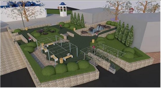 Στη διαδρομή του επισκέπτη έχουμε νησίδες χαμηλού πρασίνου, για να επικοινωνεί οπτικά με την πλατεία της Εκκλησίας, βραχόκηπο σε δυο επίπεδα με χαλίκι για φυσικό σκηνικό, και παιδική χαρά. Ο χώρος θα είναι παντού προσβάσιμος με ράμπες για ΑμεΑ.