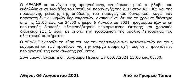 20.00 - 21.00: Πόλη της Κω (Κανάρη, Αβέρωφ, Λιμάνι, Κέντρο), Μαρμάρι, Καρδάμαινα (Ανατολικη πλευρά), Μαστιχάρι, Σταυρού Πέραμα, Μαρμάρι