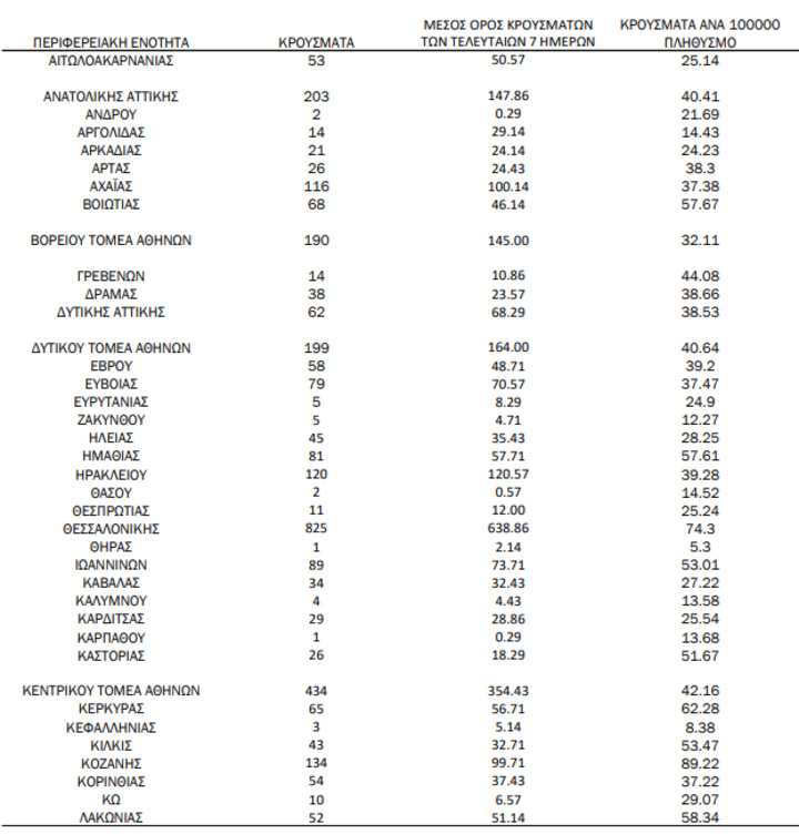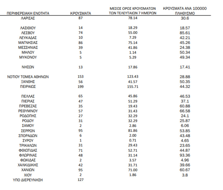Με βάση τα επιβεβαιωμένα κρούσματα των τελευταίων 7 ημερών, 178 θεωρούνται σχετιζόμενα με ταξίδι από το εξωτερικό και 3.087 είναι σχετιζόμενα με ήδη γνωστό κρούσμα.