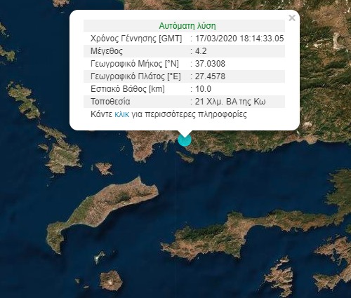 Νέα σεισμική δόνηση 4,2 R ταρακούνησε πριν από λιγο την Κω. Ο σεισμός σημειώθηκε 21 χλμ Βορειοανατολικά της Κω και είχε εστιακό βάθος 10 χλμ