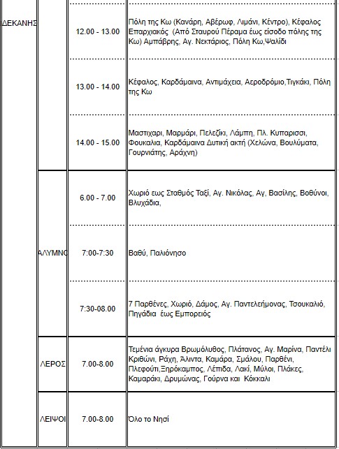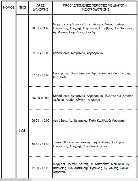 Ο ΔΕΔΔΗΕ σε συνέχεια της προηγούμενης ενημέρωσης μετά τη βλάβη που εκδηλώθηκε σε Μονάδες του σταθμού παραγωγής της ΔΕΗ στον ΑΣΠ Κω και της προσωρινής μείωσης της απόδοσης του παραγωγικού δυναμικού, λόγω των παρατεταμένων υψηλών θερμοκρασιών, ανακοινώνει ότι για το χρονικό διάστημα από τις 00:00 έως 15:00 προγραμματίζει για αύριο 5 Αυγούστου 2021, εκ περιτροπής διακοπές ηλεκτροδότησης περιορισμένης έκτασης και χρονικής διάρκειας έως 1μιση ώρα, με σκοπό την εξασφάλιση της ομαλής λειτουργίας του ηλεκτρικού συστήματος.
