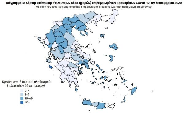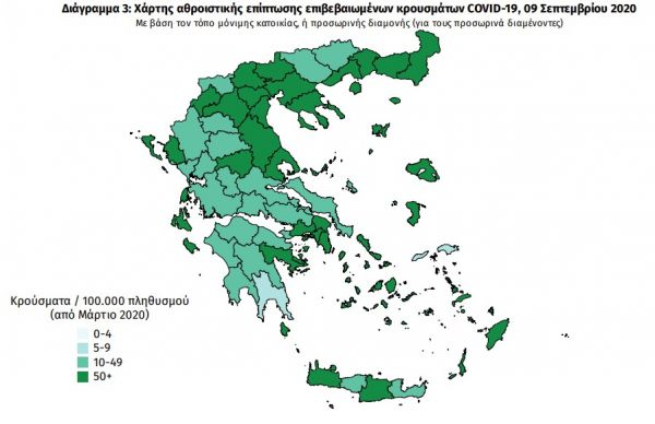 Ο χάρτης αποτυπώνει τη γεωγραφική κατανομή των συνολικών κρουσμάτων COVID-19 (από την αρχή της επιδημίας) ανά Περιφερειακή Ενότητα της χώρας, με βάση την δηλωθείσα διεύθυνση μόνιμης κατοικίας του ασθενούς, ή τη διεύθυνση προσωρινής διαμονής για τους τουρίστες και άλλους προσωρινά διαμένοντες στην Ελλάδα.