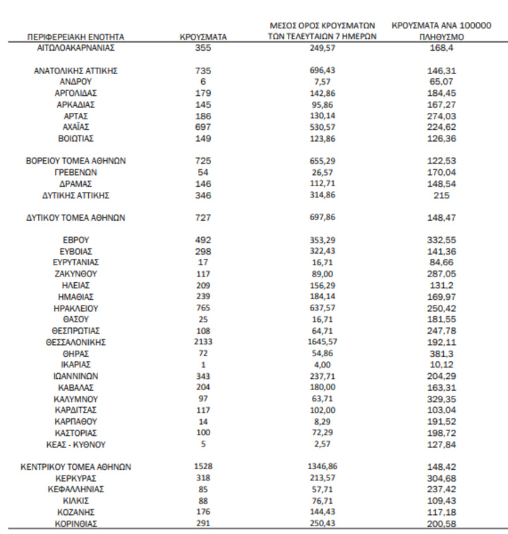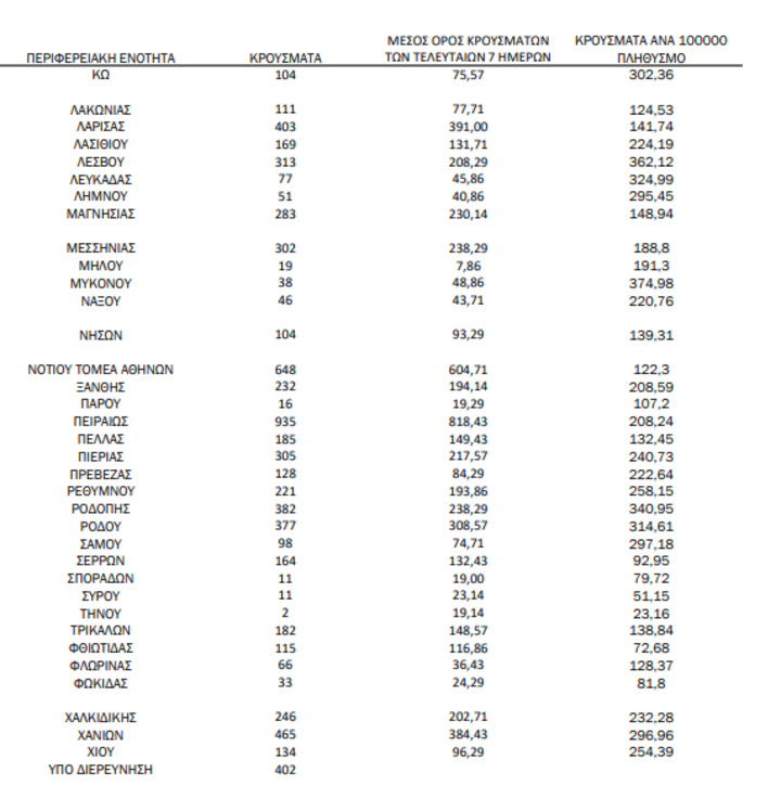 Ο συνολικός αριθμός των κρουσμάτων ανέρχεται σε 1.940.723 (ημερήσια μεταβολή +1.0%), εκ των οποίων 49.8% άνδρες. Με βάση τα επιβεβαιωμένα κρούσματα των τελευταίων 7 ημερών, 431 θεωρούνται σχετιζόμενα με ταξίδι από το εξωτερικό και 1.856 είναι σχετιζόμενα με ήδη γνωστό κρούσμα.