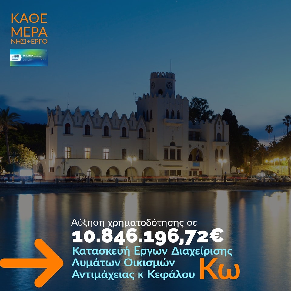 Με απόφαση του Περιφερειάρχη Νοτίου Αιγαίου, Γιώργου Χατζημάρκου, αυξάνεται κατά 1,00 εκατ. € η χρηματοδότηση της Πράξης «Κατασκευή έργων διαχείρισης λυμάτων οικισμών Αντιμάχειας και Κεφάλου Νήσου Κω», προκειμένου το έργο που βρίσκεται στην τελική ευθεία, να ολοκληρωθεί ομαλά.