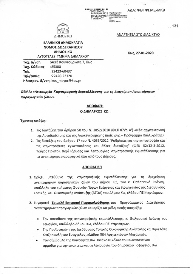 «Διαπιστώσαμε, από δημόσια έγγραφα, ότι τον Ιανουάριο 2020 ο Δήμαρχος Κω - έχοντας προφανώς υπόψιν τις σχετικές διατάξεις της νομοθεσίας για τα ανεπιτήρητα παραγωγικά ζώα - όρισε «υπεύθυνο κτηνοτροφικής εκμετάλλευσης για τη διαχείριση ανεπιτήρητων παραγωγικών ζώων» και συγκρότησε «τριμελή επιτροπή παρακολούθησης του προγράμματος διαχείρισης ανεπιτήρητων παραγωγικών ζώων», καθώς και «συνεργείο περισυλλογής των ανεπιτήρητων παραγωγικών ζώων.