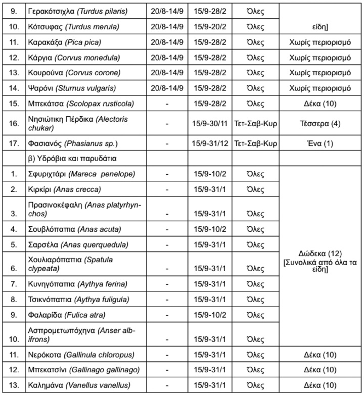 Από εκείνη τη μέρα και μέχρι τις 20 Φεβρουαρίου επιτρέπεται μεταξύ άλλων το κυνήγι του τρυγονιού του ορτυκιού και του κότσυφα, ενώ το κυνήγι του λαγού θα αρχίσει στις 15 Σεπτεμβρίου και θα λήξει στις 10 Ιανουαρίου.