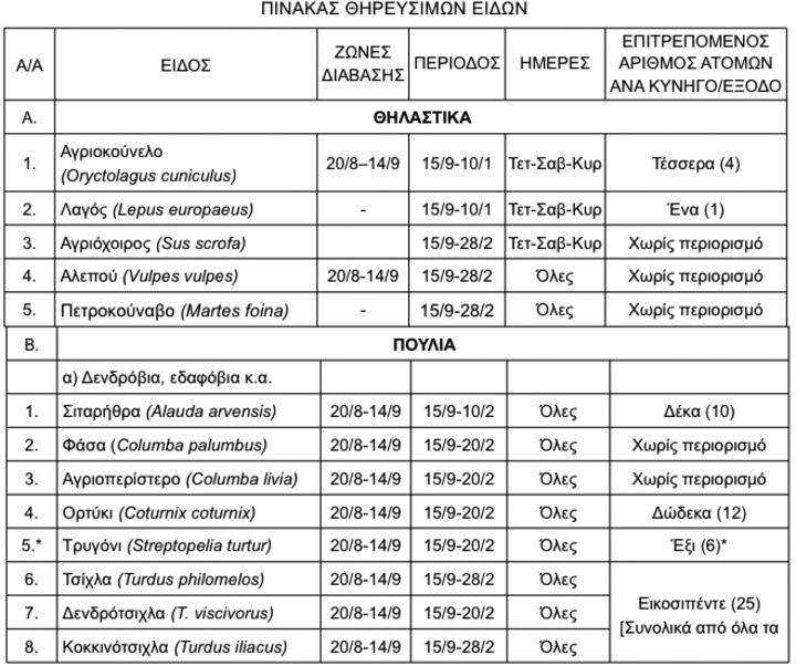 3. Τα επιτρεπόμενα να κυνηγηθούν είδη, η χρονική περίοδος και οι μέρες κυνηγίου τους, καθώς και ο μέγιστος αριθμός θηραμάτων κατά είδος, που επιτρέπεται να θηρεύει ο κάθε κυνηγός στην ημερήσια έξοδό του, αναφέρονται στον συνημμένο «ΠΙΝΑΚΑ ΘΗΡΕΥΣΙΜΩΝ ΕΙΔΩΝ».