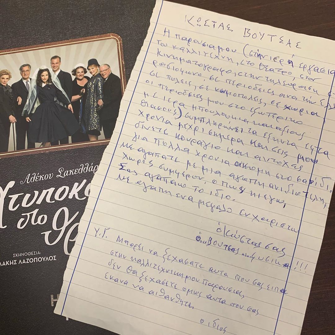 Oι «Θεατρικές Σκηνές» αποχαιρέτησαν μέσω του επίσημου λογαριασμού τους στο Instagram τον μεγάλο ηθοποιό με ένα ιδιόχειρο σημείωμα που είχε αφήσει από την τελευταία συνεργασία τους, στην παράσταση «Χτυποκάρδια στο θρανίο»«Οι ΘΕΑΤΡΙΚΕΣ ΣΚΗΝΕΣ αποχαιρετούν έναν από τους μεγαλύτερους Έλληνες ηθοποιούς του κινηματογράφου, της τηλεόρασης και του θεάτρου. Αισθανόμαστε τυχεροί που συνεργαστήκαμε με τον Κώστα Βουτσά. Συλλυπητήρια στην οικογένεια του. Όπως μας έγραψε ο ίδιος σε χειρόγραφη αφιέρωση κατά την περίοδο της συνεργασίας μας «Μπορεί να ξεχάσετε αυτά που σας είπα στην καλλιτεχνική μου παρουσία, δεν θα ξεχάσετε όμως αυτά που σας έκανα να αισθανθείτε…». Καλό ταξίδι Κώστα Βουτσά» , έγραφε στο σημείωμα.