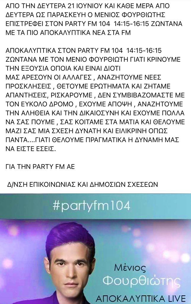 Σχεδόν περίπου έναν μήνα μετά την προφυλάκισή του, ο Μένιος Φουρθιώτης, σύμφωνα με το δελτίο Τύπου που δημοσίευσε το Party FM 104, ξεκινά δίωρη καθημερινή ραδιοφωνική εκπομπή από τις 14:15 έως τις 16:15. «Μας αρέσουν οι αλλαγές, αναζητούμε νέες προσκλήσεις, θέτουμε ερωτήματα και ζητάμε απαντήσεις», αναφέρεται μεταξύ άλλων στην ανακοίνωση που εξέδωσε η Διεύθυνση Επικοινωνίας και Δημοσίων Σχέσεων.