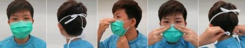πίεση του μεταλλικού στοιχείου στη ράχη της μύτης - ασφάλιση με τα κορδόνια στη μεσότητα του πίσω μέρους της κεφαλής και του λαιμού. Εάν πρόκειται για μάσκα με ελαστικούς βρόγχους αυτοί εφαρμόζονται γύρω από τα αυτιά αποφυγή επαφής της μάσκας μετά την τοποθέτηση, αλλιώς εφαρμογή της υγιεινής των χεριών πριν και μετά την επαφή