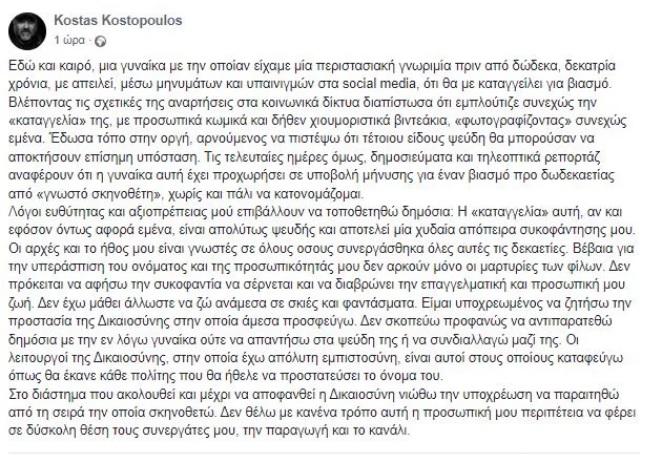 Η ανάρτηση του σκηνοθέτη Κώστα Κωστόπουλου: