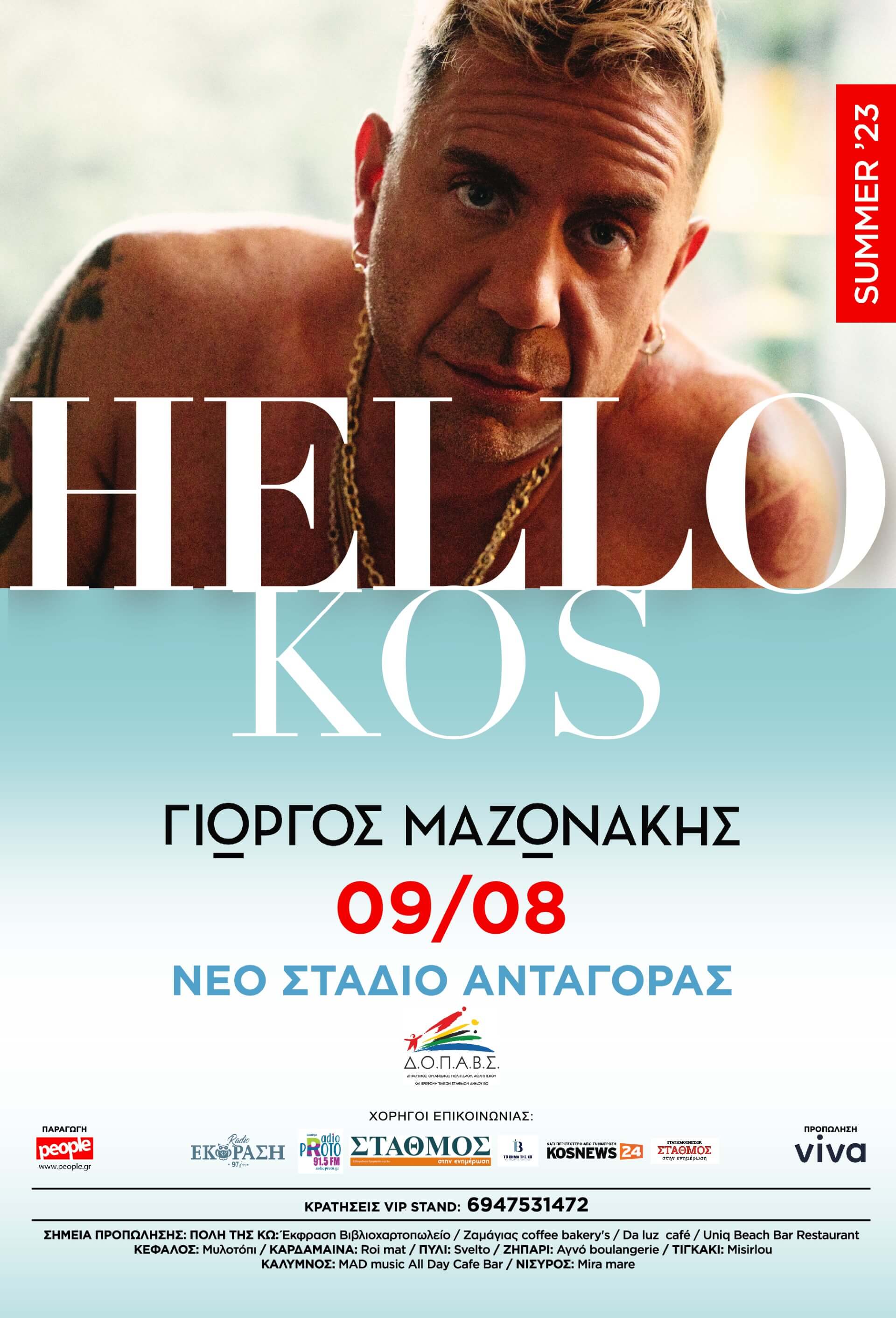 Ο Γιώργος Μαζωνάκης ανοίγει τις πόρτες του καινούριου καλοκαιριού: Μας προσκαλεί να συστηθούμε ξανά και να παιχτούμε μαζί στα γήπεδα, στις παραλίες και στις σκηνές όλης της χώρας, με την μεγαλύτερη περιοδεία του μέχρι σήμερα! Όπου κι αν βρίσκεστε, πείτε HELLO στο καλοκαίρι και καλωσορίστε την εποχή που φωτίζει την Ελλάδα, με την μουσική που φωτίζει την διάθεσή μας.