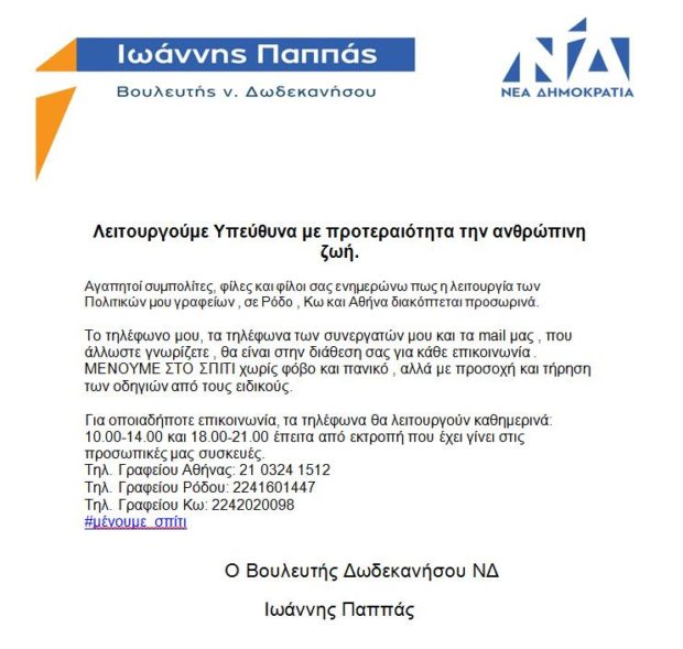 Αναστέλλει προσωρινά την λειτουργία των πολιτικών του γραφείων ο Ιωάννης Παππάς