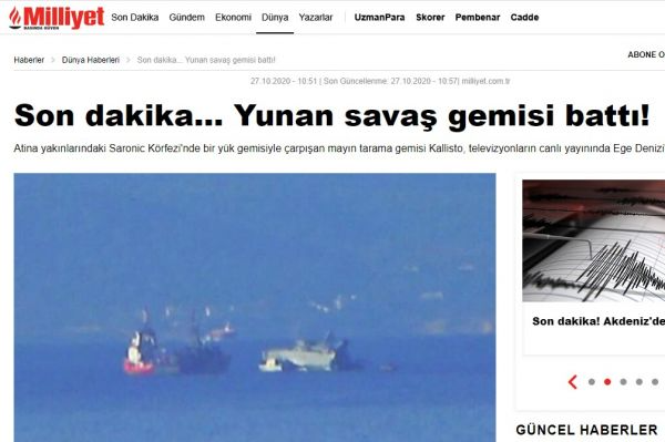 «Το Ελληνικό πλοίο του Πολεμικού Ναυτικού M-63 Καλλιστώ συγκρούστηκε με το κοντέινερ έξω από το λιμάνι του Πειραιά και κόπηκε στα δυο. Η κατάρρευση του σκάφους με τόσο εύκολο τρόπο την ώρα του ατυχήματος δείχνει την αδυναμία του Ελληνικού Πολεμικού Ναυτικού», αναφέρει το δημοσίευμα της Yeni Safak, ενώ η εφημερίδα Μιλιέτ σχεδόν… βύθισε το σκάφος του Πολεμικού Ναυτικού.