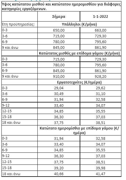 Αντίστοιχα από 1-1-2022 ο κατώτατος μισθός διαμορφώνεται στα 663 ευρώ τον μήνα (ή 773,5 ευρώ με αναγωγή των 14 μισθών) ενώ με τις τριετίες φθάνει έως και 198,9 ευρώ υψηλότερα. Το κατώτατο ημερομίσθιο από 1-1-2022 διαμορφώνεται σε 29,62 ευρώ.