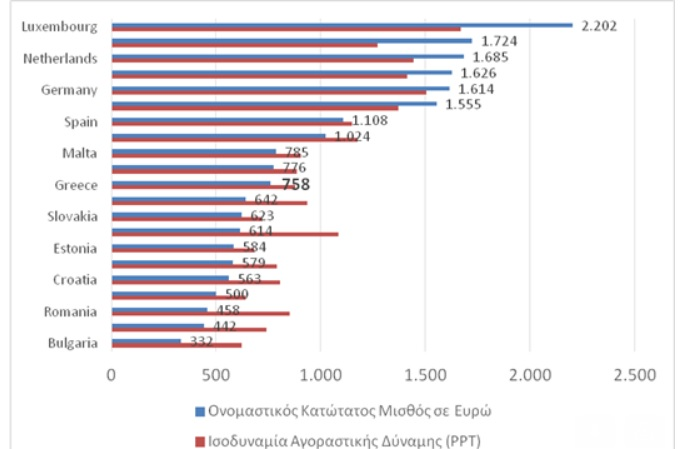 Μεταξύ των 21 κρατών-μελών της ΕΕ που έχουν νομοθετημένο κατώτατο μισθό, η Ελλάδα βρίσκεται στη μέση της κατάταξης όσον αφορά το ύψος του κατώτατου μισθού (11η με βάση τον ονομαστικό και 13η με βάση τα Ισοδύναμα Αγοραστικής Δύναμης), υποστηρίζει το υπ. Εργασίας.
