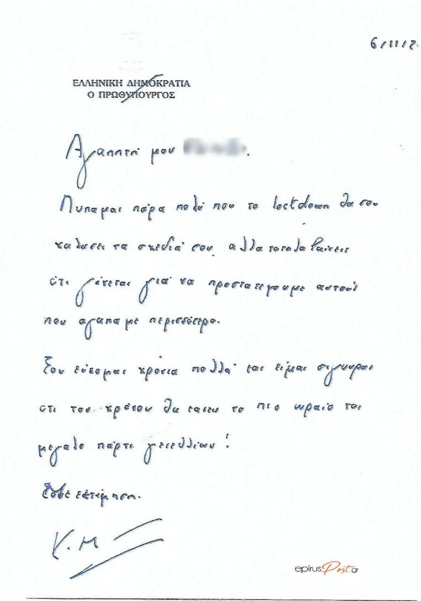 «Αγαπητή μου…Λυπάμαι πάρα πολύ που το lockdown θα σου χαλάσει τα σχέδιά σου αλλά καταλαβαίνει ότι γίνεται για να προστατέψουμε αυτούς που αγαπάμε περισσότερο. Σου εύχομαι χρόνια πολλά και είμαι σίγουρος ότι του χρόνου θα κάνεις το πιο ωραίο και μεγάλο πάρτι γενεθλίων», αναφέρει ο Κυριάκος Μητσοτάκης.