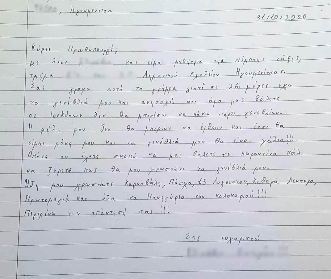 «.. Αν έχετε σκοπό να μας βάλετε σε καραντίνα πάλι να ξέρετε πως θα μου χρωστάτε τα γενέθλιά μου. Ήδη μου χρωστάτε Καρναβάλι, Πάσχα, 15Αύγουστο, Καθαρά Δευτέρα, Πρωτομαγιά και όλα τα πανηγύρια του καλοκαιριού», γράφει η 10χρονη και καταλήγει με τη φράση «περιμένω την απάντησή σας».