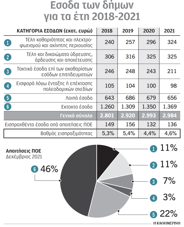 Σήμερα οι ληξιπρόθεσμες απαιτήσεις των δήμων από βεβαιωθέντα έσοδα κατά τα προηγούμενα έτη ανέρχονται περίπου σε 3 δισ. ευρώ. Εάν μάλιστα συνυπολογιστούν και τα λοιπά νομικά πρόσωπα, οι απαιτήσεις αυξάνονται στα 3,4 δισ. ευρώ, ενώ ο βαθμός εισπραξιμότητας αυτών των εσόδων είναι εξαιρετικά χαμηλός και έχει υποχωρήσει από το 5,3% το 2018 στο 4,6% το 2021. Ακόμη ένα στοιχείο έντονου προβληματισμού είναι ότι διάφορες ρυθμίσεις που εφαρμόστηκαν τα προηγούμενα έτη (το 2017, το 2019 και το 2021) δεν κατάφεραν να βελτιώσουν καθόλου την εισπραξιμότητα.