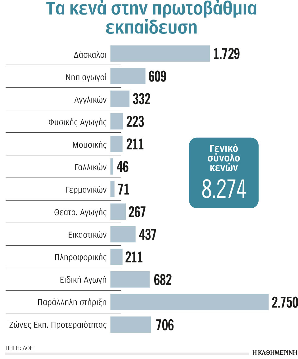 Τις 10.000 προσεγγίζουν τα εκπαιδευτικά κενά σε πρωτοβάθμια και δευτεροβάθμια εκπαίδευση, με την πλειονότητα στα δημοτικά σχολεία και την παράλληλη στήριξη μαθητών με ειδικές ανάγκες. Αμεσα, ίσως και σήμερα, αναμένεται νέος γύρος προσλήψεων αναπληρωτών από το υπουργείο Παιδείας.