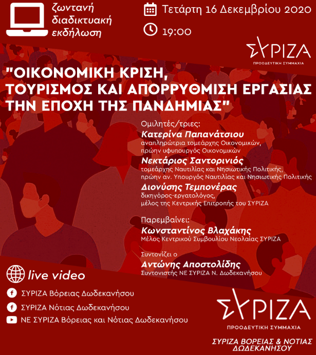 Οι ΝΕ ΣΥΡΙΖΑ Βόρειας και Νότιας Δωδεκανήσου διοργανώνουν διαδικτυακή εκδήλωση για τον τουρισμό και την εργασία με θέμα "Οικονομική κρίση, τουρισμός και απορρύθμιση εργασίας την εποχή της πανδημίας" την Τετάρτη 16 Δεκεμβρίου 2020 και ώρα 19:00.