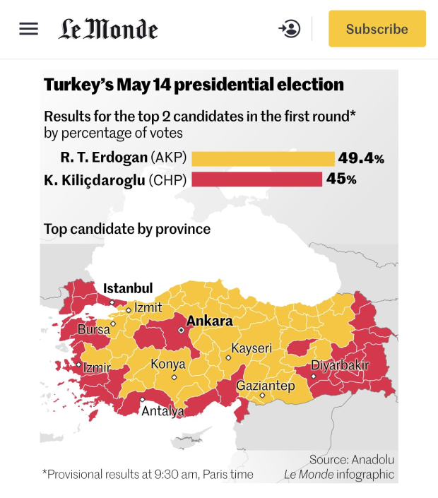 Η γαλλική εφημερίδα Le Monde σε δημοσίευση της αγγλόφωνης υπηρεσίας της για τα αποτελέσματα των τουρκικών εκλογών, σε infographic που έδειχνε πως «βάφτηκαν» οι εκλογικές περιφέρειες της Τουρκίας βάσει προτιμήσεων των ψηφοφόρων, εμφάνισε χάρτη όπου απεικόνιζε τα μισά νησιά του Αιγαίου ως τουρκικά.