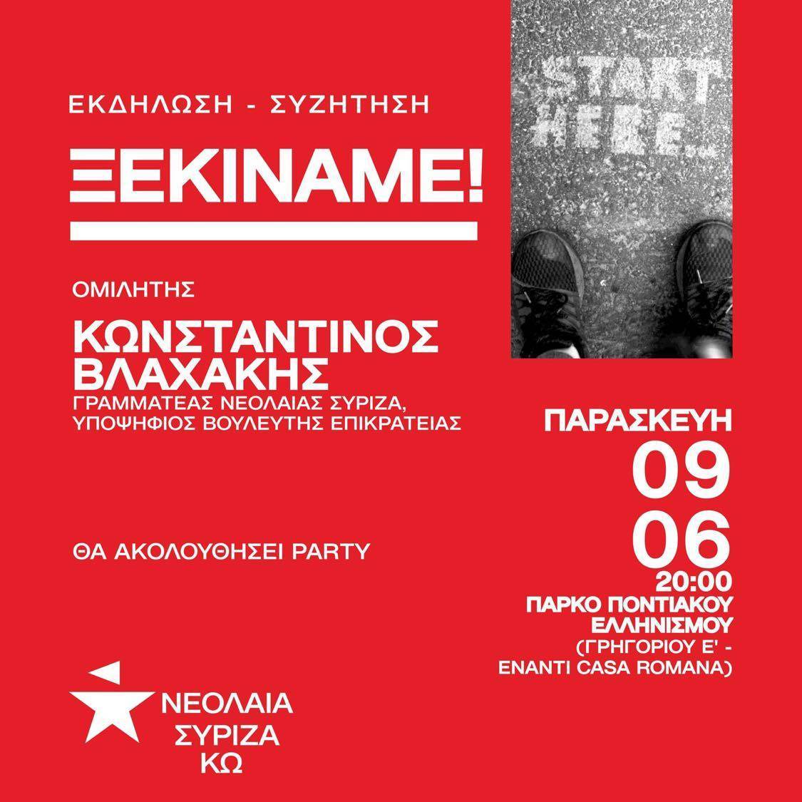 Η Νεολαία ΣΥΡΙΖΑ Κω ανοίγει τις πόρτες της, με εκδήλωση με ομιλητή τον Γραμματέα του ΚΣ της Νεολαίας ΣΥΡΙΖΑ και υπ. Βουλευτή Επικρατείας Κωνσταντίνο Βλαχάκη.