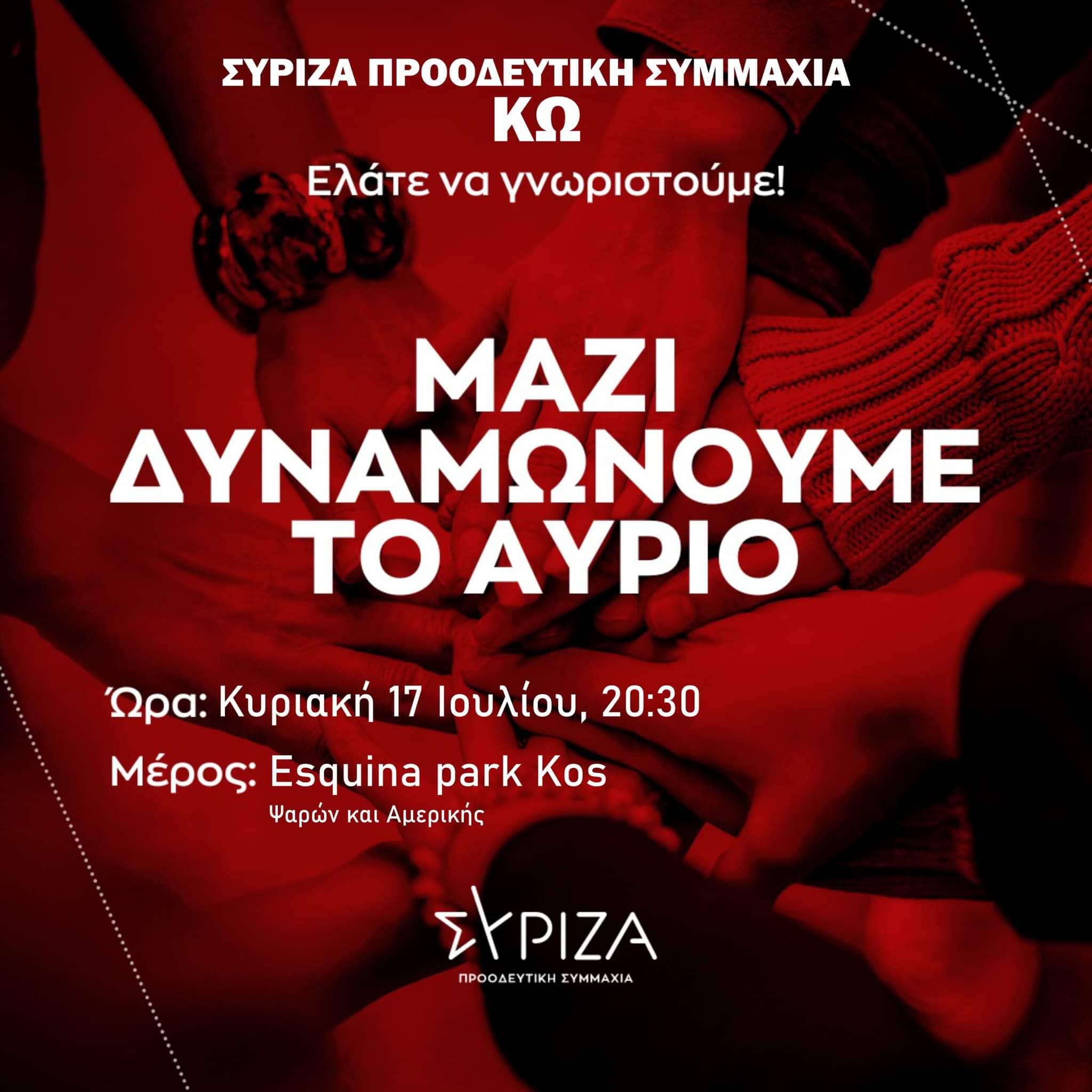 Η Οργάνωση Μελών Κω του ΣΥΡΙΖΑ - Προοδευτική Συμμαχία διοργανώνει ανοιχτή εκδήλωση υποδοχής των νέων μελών και προσκαλεί παλαιά και νέα μέλη, καθώς και τους/τις φίλους/ες του κόμματος, την Κυριακή 17 Ιουλίου (8.30 μ.μ.) στο Esquina Park Kos (Ψαρών και Αμερικής).