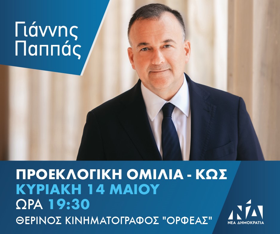 Σας προσκαλώ στην προεκλογική μου ομιλία στο νησί της Κω, η οποία θα πραγματοποιηθεί στον Θερινό Κινηματογράφο «Ορφέας», την Κυριακή 14 Μαΐου και ώρα 19.30.