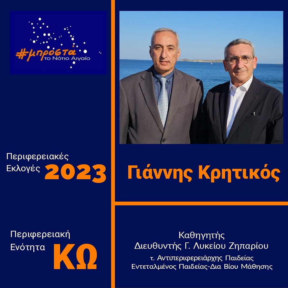 Ο κ. Κρητικός, Καθηγητής και Διευθυντής Γενικού Λυκείου Ζηπαρίου, Εντεταλμένος Περιφερειακός Σύμβουλος Παιδείας, Δια Βίου Μάθησης και Απασχόλησης Δωδεκανήσου και Γραμματέας Περιφερειακού Συμβουλίου Νοτίου Αιγαίου καθώς και τ. Αντιπεριφερειάρχης Παιδείας, με πλούσια εμπειρία στην τοπική Αυτοδιοίκηση πρώτου και δεύτερου βαθμού, αναφέρει στη δήλωσή του, με την οποία ανακοινώνει την απόφασή του να συμπορευτεί με τον Γιώργο Χατζημάρκο: