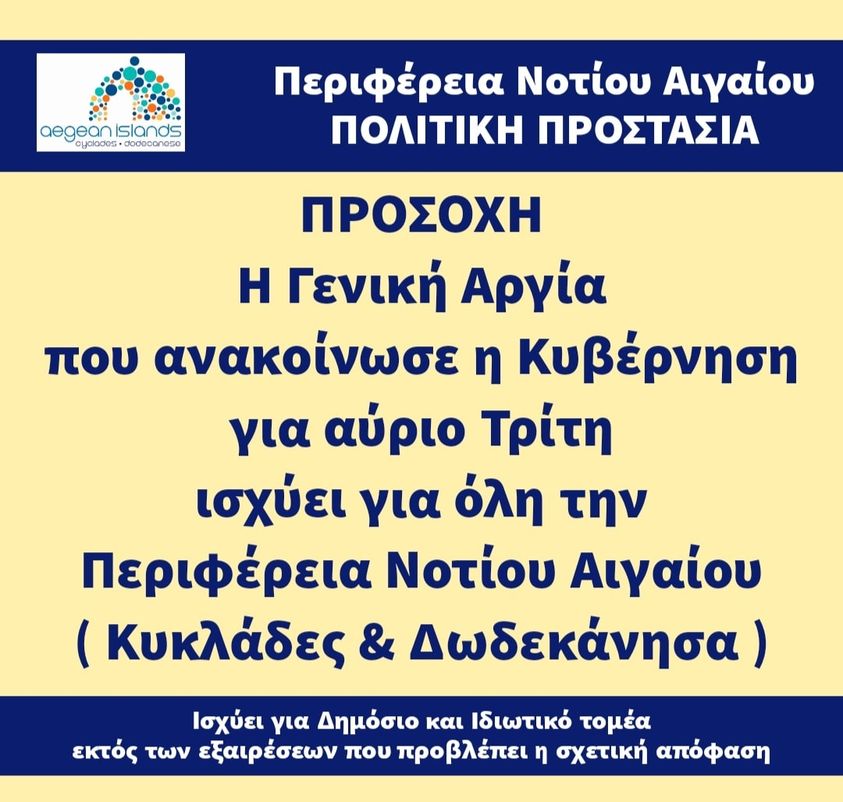 Αλαλούμ έχει επικρατήσει σχετικά με την αυριανή αργία, λόγω κακοκαιρίας. Ενώ νωρίτερα ο αρμόδιος Υπουργός κ. Στυλιανίδης ανακοίνωσε τις περιοχές όπου θα ισχύσει η αυριανή αργία σε δημόσιο και ιδιωτικό τομέα (στην περιφέρεια Αττικής, στους νομούς Βοιωτίας, Ευβοίας, Κυκλάδων, στις Σποράδες και στην Κρήτη), λίγο αργότερα ο Βουλευτής της ΝΔ Γ. Παππάς, έκανε σχετικό αίτημα να συμπεριληφθούν και τα Δωδεκάνησα, ενώ και η Περιφέρεια λίγο αργότερα, ανακοίνωσε ότι στις σχετικές περιοχές, συμπεριλαμβάνεται όλη η Περιφέρεια Ν. Αιγαίου (Κυκλάδες & Δωδεκάνησα).