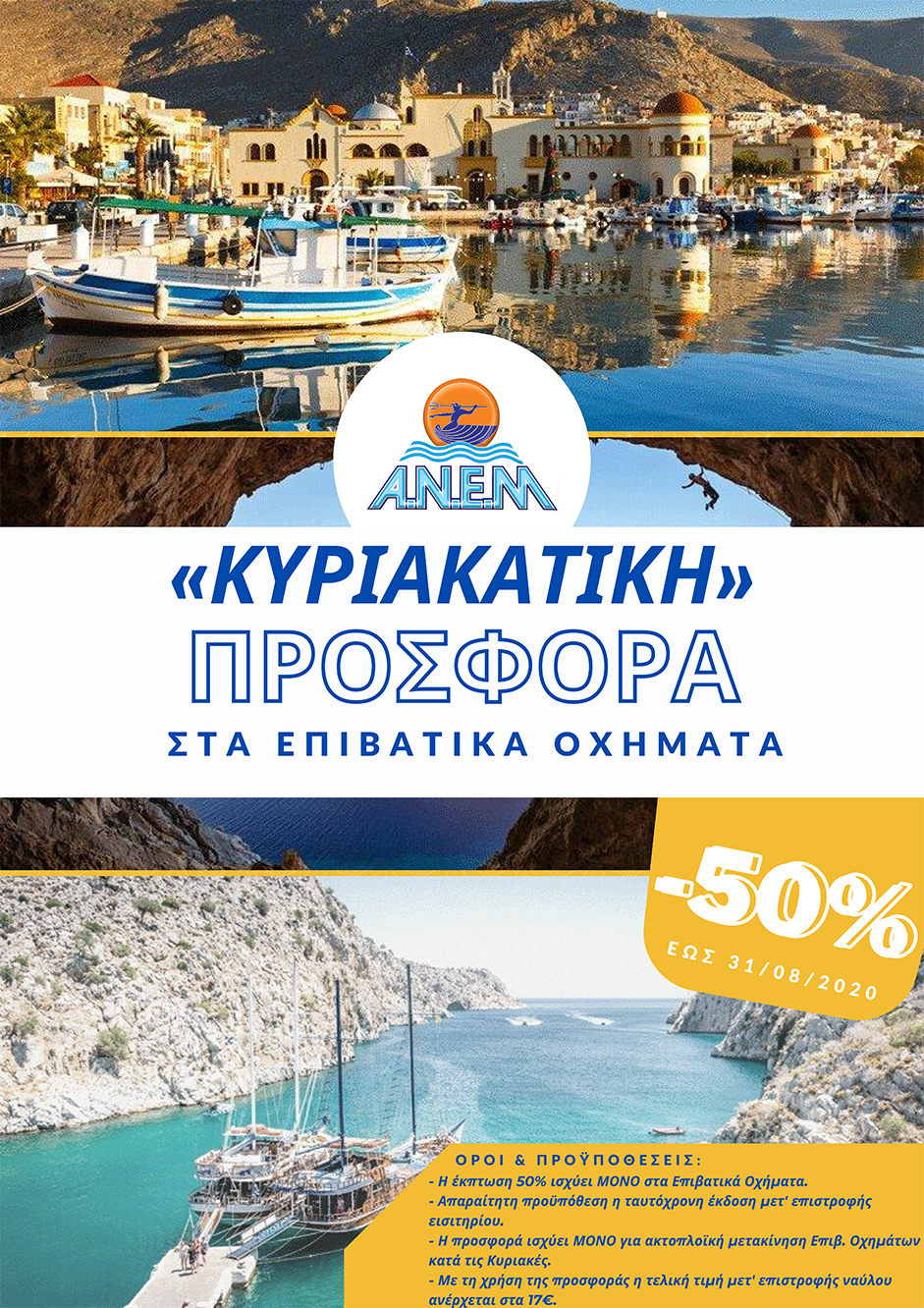 Σε συνέχεια των παραπάνω, η εταιρεία μας θέλοντας να δώσει την δυνατότητα για μια «Κυριακάτικη Ημερήσια» επίσκεψη/απόδραση, στην Κάλυμνο ή την Κω, θα παρέχει Έκπτωση 50% στην μετ’επιστροφής μετακίνηση Επιβατικών Οχημάτων, κάθε Κυριακή και για όλο τον Αύγουστο.