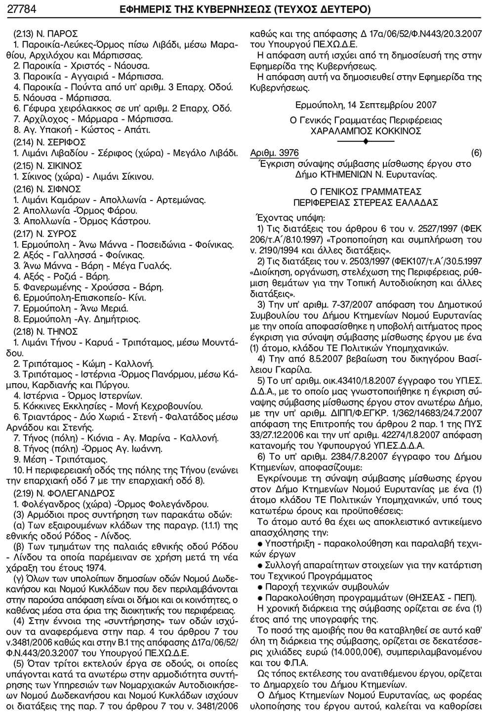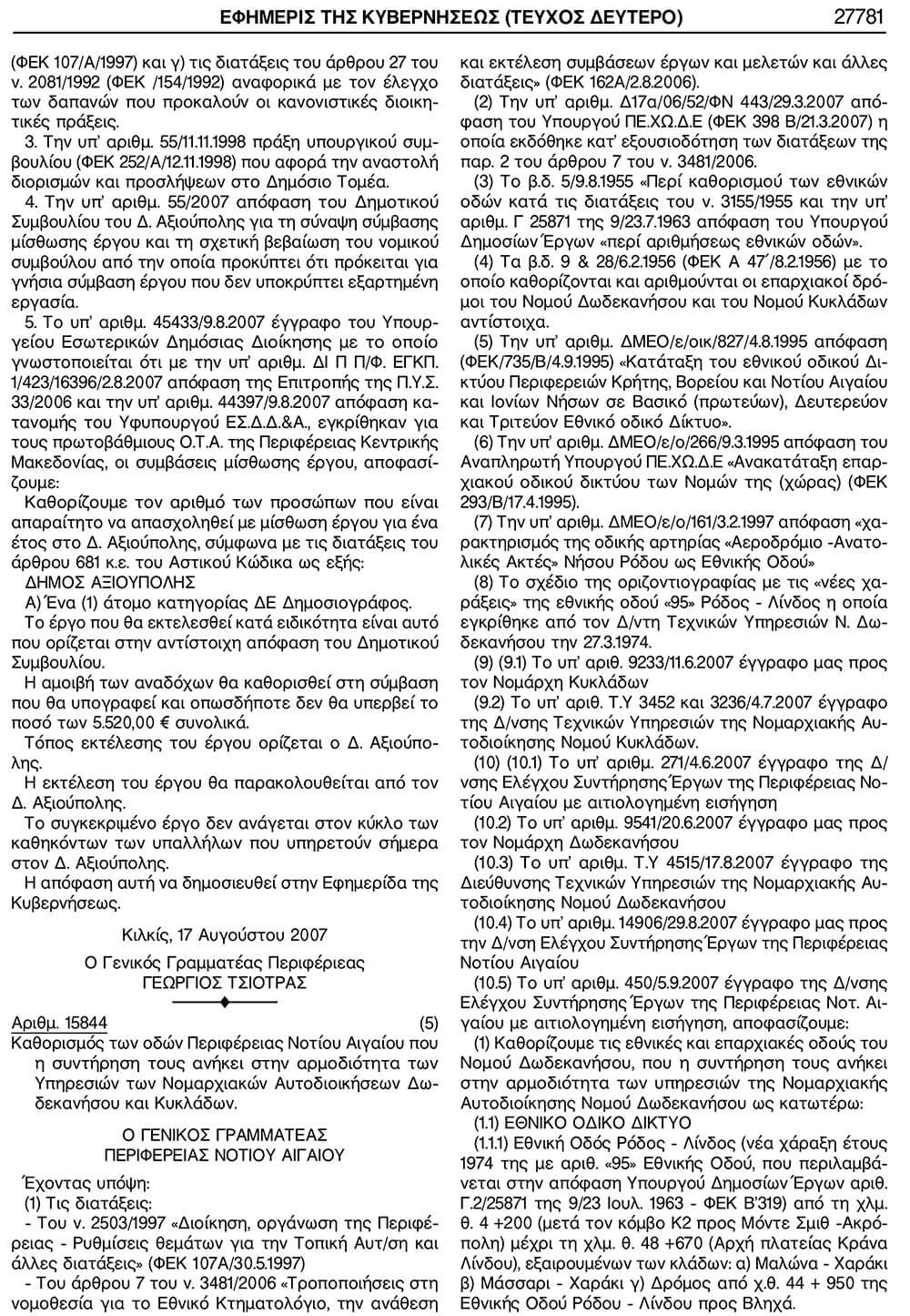 1) Το ΦΕΚ 1985/10-10-2007 (εδάφιο 5), όπου σύμφωνα με την Απόφαση αρ. 15844/14-09-2007 του Γενικού Γραμματέα Περιφέρειας Ν. Αιγαίου καθορίστηκαν οι οδοί της Περιφέρειας Νοτίου Αιγαίου που η συντήρηση τους ανήκε στην αρμοδιότητα των Υπηρεσιών των Νομαρχιακών Αυτοδιοικήσεων Δωδεκανήσου και Κυκλάδων, ως ακολούθως: