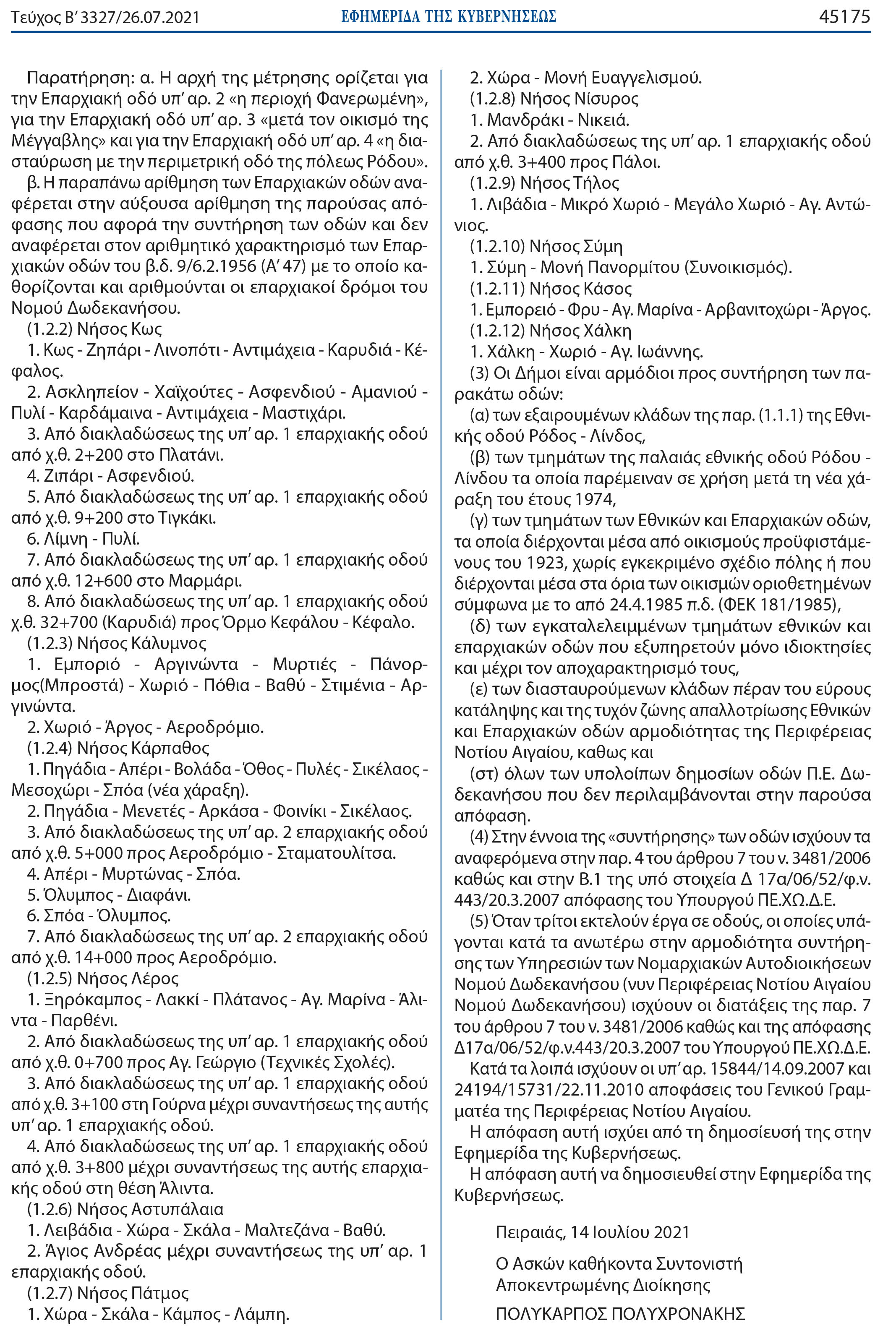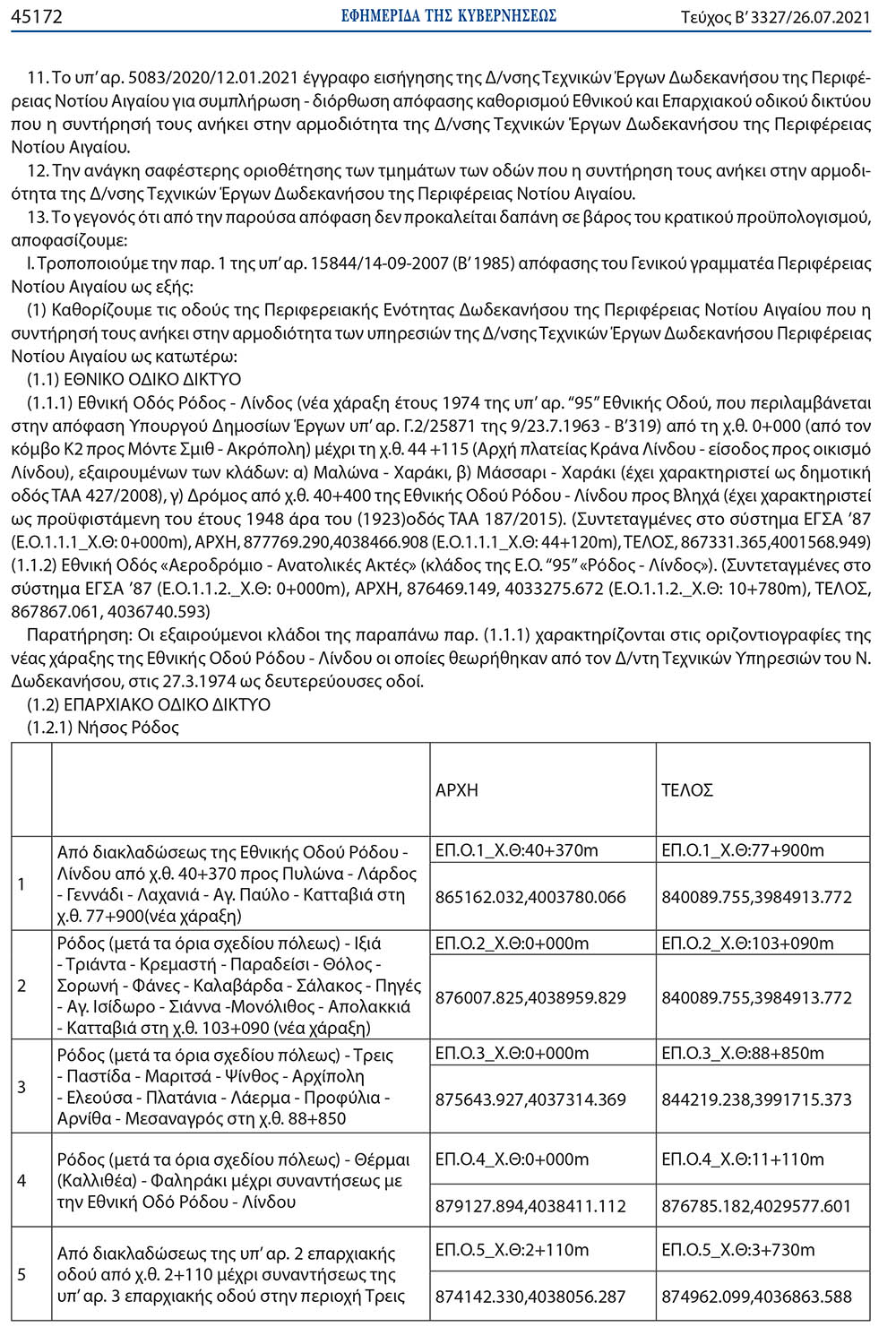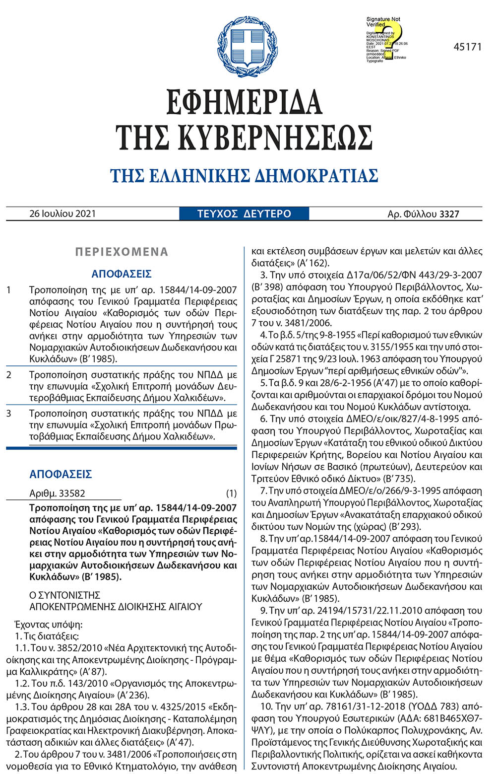 2) Το ΦΕΚ 3327/26-07-2021 (εδάφιο 1) με το οποίο, σύμφωνα με την Απόφαση αρ. 33582 του Συντονιστή Αποκεντρωμένης Διοίκησης Αιγαίου, έγινε τροποποίηση της με υπ’ αρ.15844/14-09-2007 Απόφασης του Γενικού Γραμματέα Περιφέρειας Νοτίου Αιγαίου με τίτλο «Καθορισμός των οδών Περιφέρειας Νοτίου Αιγαίου που η συντήρησή τους ανήκει στην αρμοδιότητα των Υπηρεσιών των Νομαρχιακών Αυτοδιοικήσεων Δωδεκανήσου και Κυκλάδων» (Β’ 1985), ως εξής:
