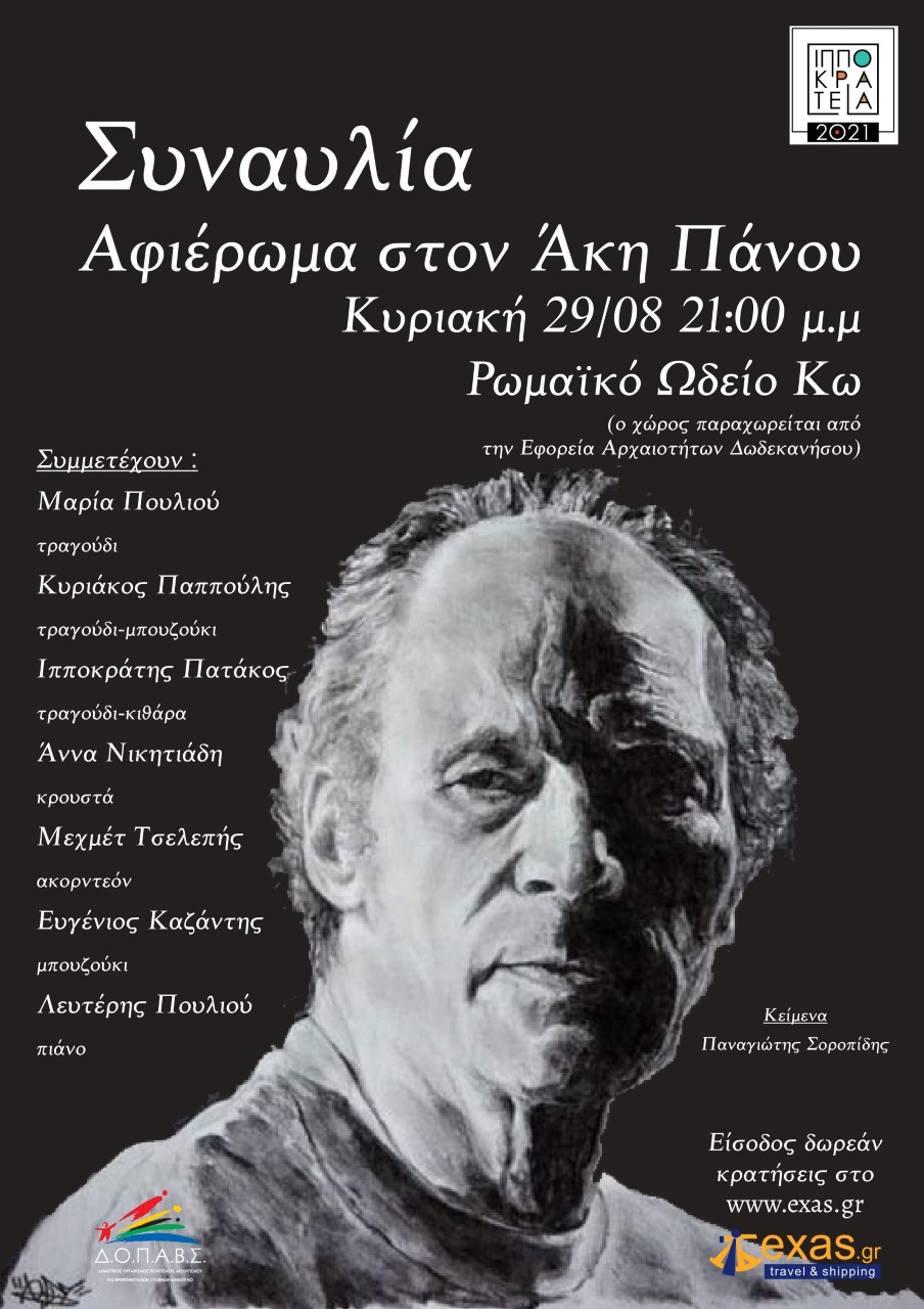 Ο Δ.Ο.Π.Α.Β.Σ. στα πλαίσια των Θερινών Ιπποκρατείων 2021 παρουσιάζει συναυλία- αφιέρωμα στον Άκη Πάνου την Κυριακή 29 Αυγούστου 2021 και ώρα 21:00 στο Ρωμαϊκό Ωδείο.