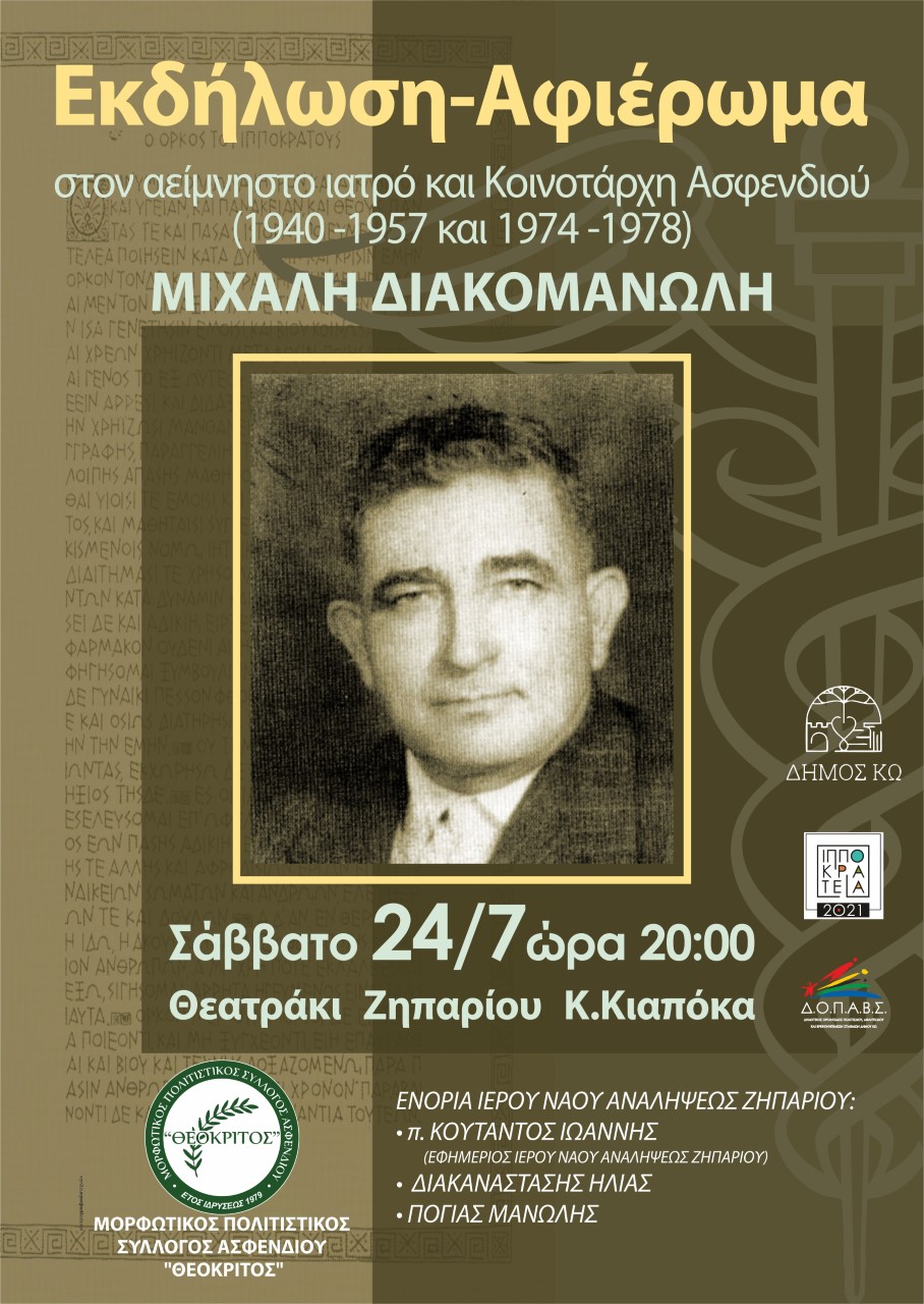 Ο Δ.Ο.Π.Α.Β.Σ. , η Κοινότητα Ασφενδιού, ο Μορφωτικός Πολιτιστικός Σύλλογος «Θεόκριτος» & η Ενορία Ι.Ν. Αναλήψεως Ζηπαρίου στα πλαίσια των Θερινών Ιπποκρατείων 2021 διοργανώνουν εκδήλωση- αφιέρωμα στον αείμνηστο ιατρό και επί πολλά χρόνια Κοινοτάρχη Ασφενδιού, Μιχάλη Διακομανώλη. Η εκδήλωση θα γίνει το Σάββατο 24 Ιουλίου και ώρα 20:00 στο Πάρκο Κ. Κιαπόκα στο Ζηπάρι.
