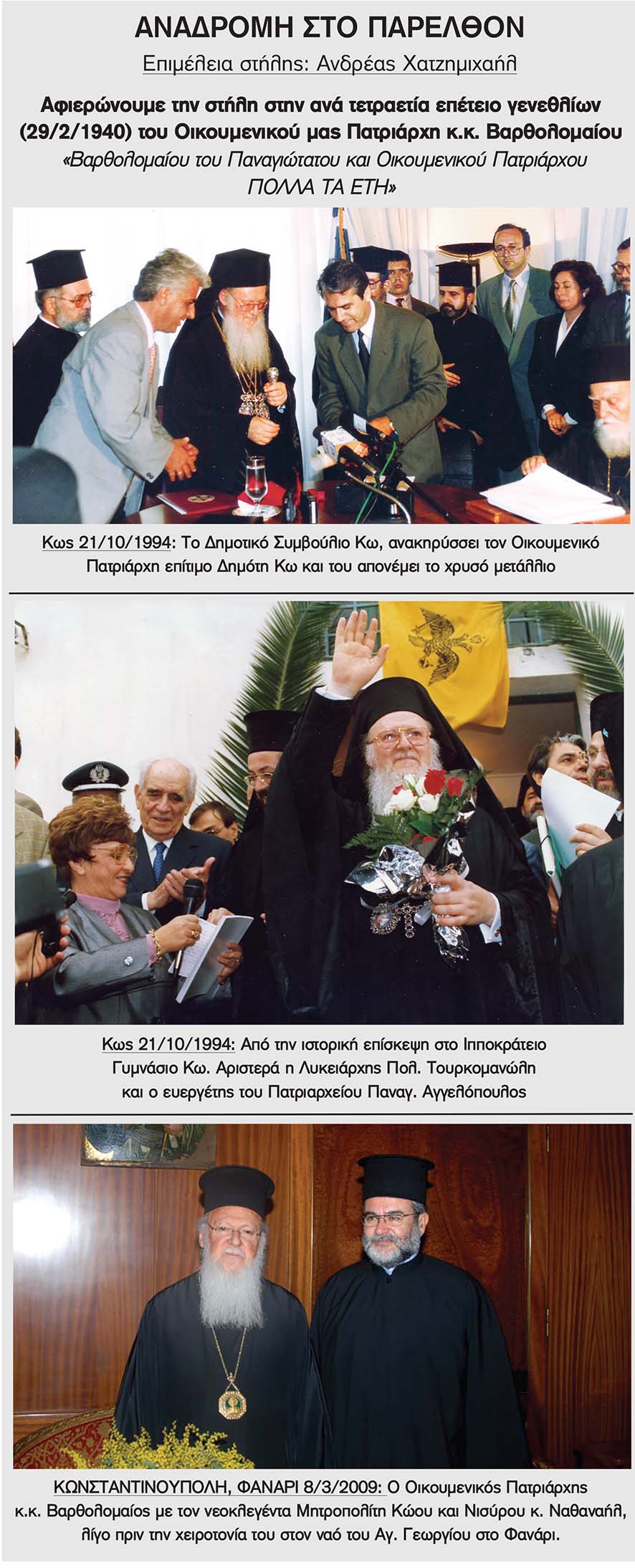 Αφιερώνουμε την στήλη στην ανά τετραετία επέτειο γενεθλίων (29/2/1940) του Οικουμενικού μας Πατριάρχη κ.κ. Βαρθολομαίου