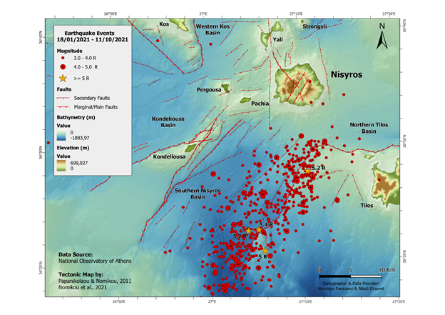 Το Εργαστήριο Φυσικής Γεωγραφίας του Τμήματος Γεωλογίας και Περιβάλλοντος (ΤΓΓ) του Εθνικού και Καποδιστριακού Πανεπιστημίου Αθηνών (ΕΚΠΑ) έχει μελετήσει εντατικά τον υποθαλάσσιο χώρο της περιοχής Κω-Νισύρου συνδυάζοντας τα χερσαία και θαλάσσια δεδομένα και έχει δημιουργήσει έναν ενιαίο συνθετικό μορφοτεκτονικό χάρτη της περιοχής, πραγματοποιώντας εργασίες υπαίθρου το καλοκαίρι του 2021 σε συνεργασία με τον Δήμο Νισύρου. Σύμφωνα με τα επιστημονικά δεδομένα που έχουν αναλυθεί, παρατηρείται μία δραστηριότητα στο ανατολικό περιθωριακό ρήγμα της υποθαλάσσιας λεκάνης της Νότιας Νισύρου με διεύθυνση ΒΑ-ΝΔ χωρίς να σχετίζεται με το ηφαίστειο της Νισύρου.