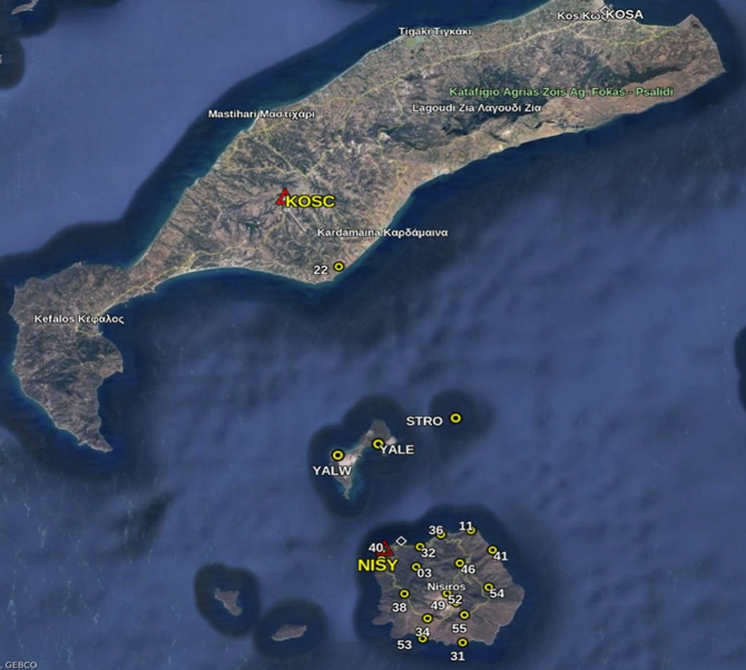 Εικόνα 1. Δίκτυο ΕΚΠΑ μόνιμων και μη-μόνιμων σταθμών μέτρησης εδαφικής κίνησης περιοχής Νισύρου – Κω-Γυαλί. Οι σταθμοί NISY και KOSC είναι μόνιμοι σταθμοί GPS με παροχή δεδομένων σε πραγματικό χρόνο.