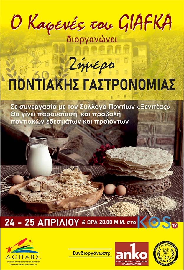 Διήμερο Ποντιακής γαστρονομίας διοργανώνει ο ΔΟΠΑΒΣ σε συνεργασία με τον Πολιτιστικό σύλλογο Ποντίων ‘’Ο Ξενιτέας’’ και την υποστήριξη της Σχολής τουριστικών επαγγελμάτων ΑΝΚΩ και της εκπομπής ‘’Ο καφενές του GIAFKA’’ με στόχο την προβολή και παρουσίαση παραδοσιακών ποντιακών συνταγών.
