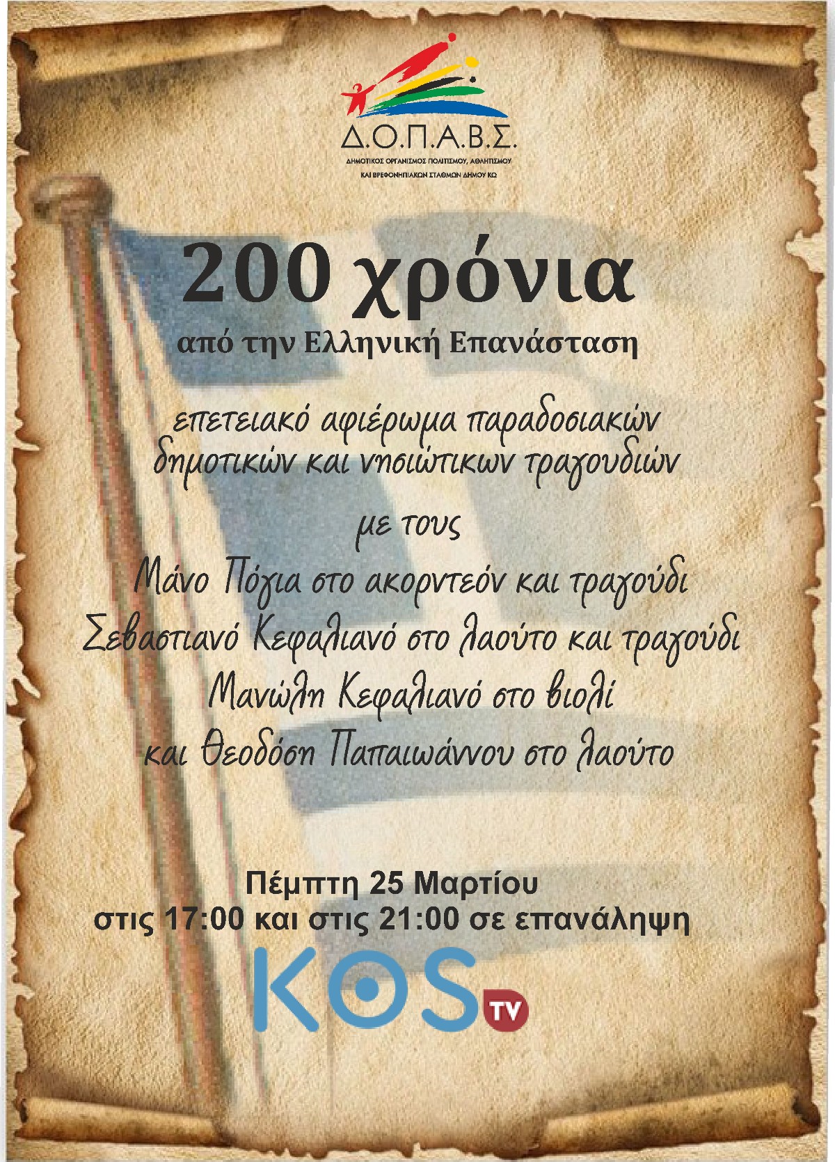 Ο ΔΟΠΑΒΣ με αφορμή την επέτειο της 25ης Μαρτίου και τα 200 χρόνια από την Ελληνική Επανάσταση διοργανώνει επετειακό αφιέρωμα με παραδοσιακά δημοτικά και νησιώτικα τραγούδια με τους παραδοσιακούς οργανοπαίχτες Μάνο Πόγια στο ακορνττεόν και τραγούδι, Σεβαστιανό Κεφαλιανό στο λαούτο και τραγούδι, Μανώλη Κεφαλιανό στο βιολί και Θεοδόση Παπαιωάννου στο λαούτο.