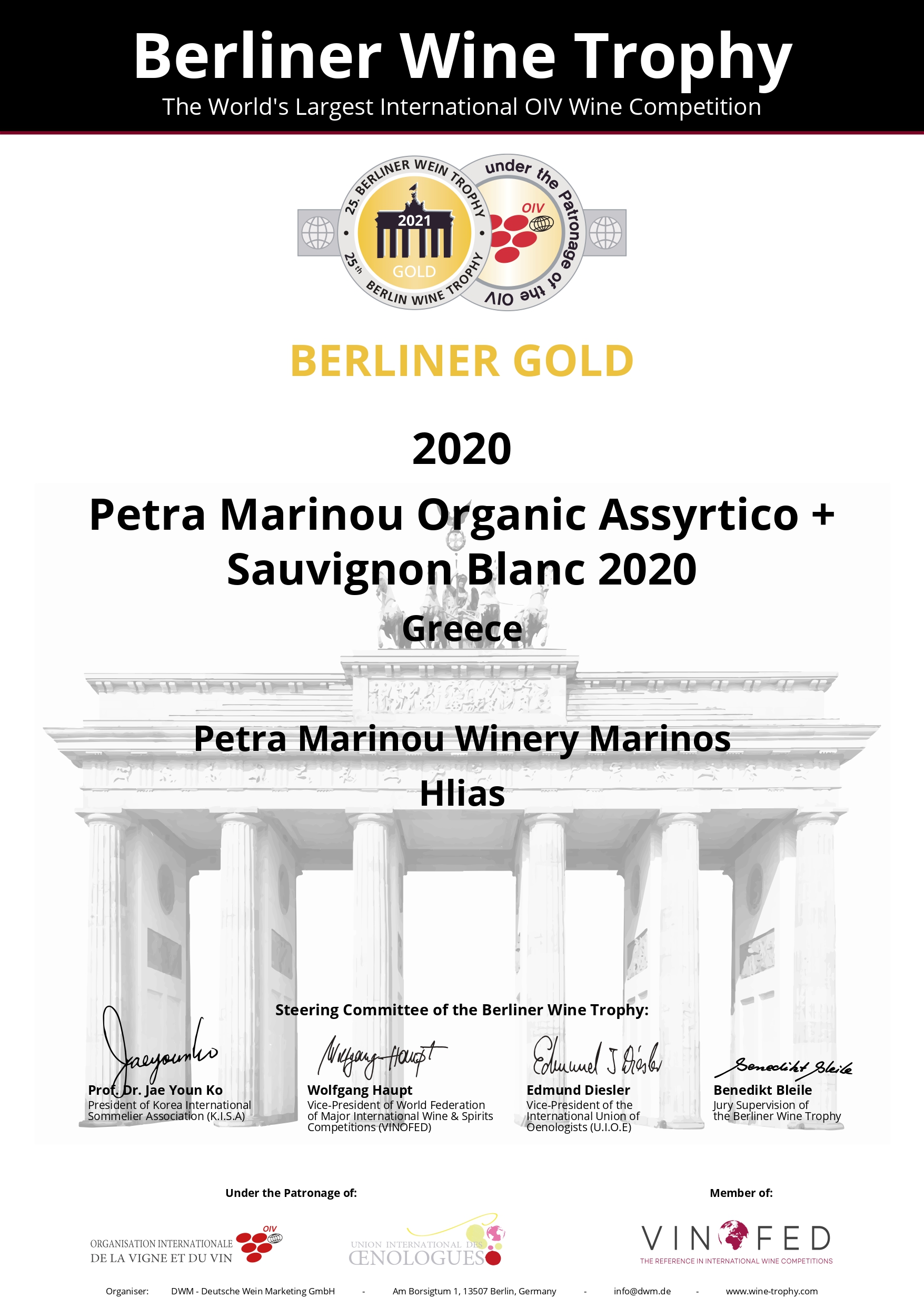 Σημαντική διάκριση έλαβε και φέτος το Οινοποιείο Petra Marinou στο μεγαλύτερο διεθνή διαγωνισμό οίνου στο Βερολίνο (BERLINER WINE TROPHY) που βράβευσε με δυο ΧΡΥΣΑ το: