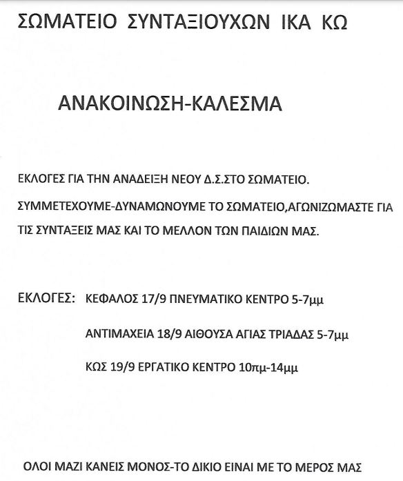 Εκλογές για την ανάδειξη νέου Δ.Σ. στο Σωματείο Συνταξιούχων ΙΚΑ ΚΩ