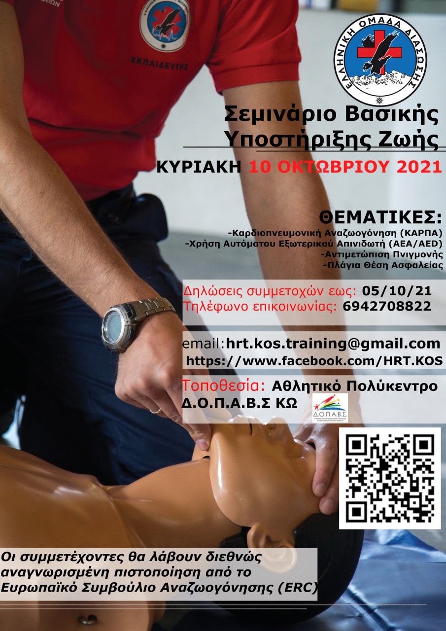 Η Ελληνική Ομάδα Διάσωσης Κω διεξάγει σεμινάριο βασικής υποστήριξης ζωής την Κυριακή 10 Οκτωβρίου 2021.