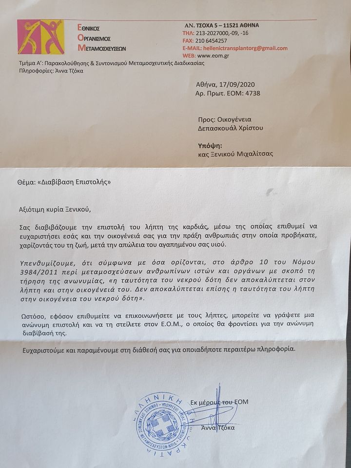 Ευχαριστήρια ανακοίνωση εξέδωσε ο Εθνικός Οργανισμός Μεταμοσχεύσεων προς την οικογένεια του Χρίστου Δεπασκουάλ, διαβιβάζοντας παράλληλα την συγκινητική ευχαριστήρια επιστολή του λήπτη καρδιάς Κωνσταντίνου/Χρυσοβαλάντη: