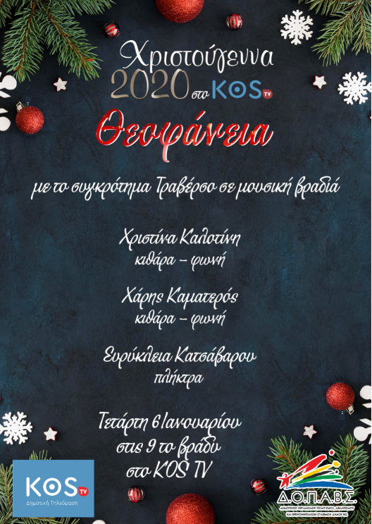 Στο πλαίσιο των εορταστικών εκδηλώσεων του ΔΟΠΑΒΣ και του KOSTVμε τίτλο ΧΡΙΣΤΟΥΓΕΝΝΑ 2020 το μουσικό συγκρότημα Τραβέρσο παρουσιάζει μουσική βραδιά την Τετάρτη6 Ιανουαρίουανήμερα των Θεοφανείων στις 9 το βράδυ στη Δημοτική Τηλεόραση.