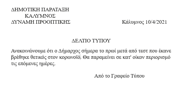 Και ο Δήμαρχος Καλυμνίων βρέθηκε θετικός στον κορωνοϊό, με τις πληροφορίες να αναφέρουν ότι είναι σε καλή κατάσταση η υγεία του και βρίσκεται σε κατ' οίκον περιορισμό.