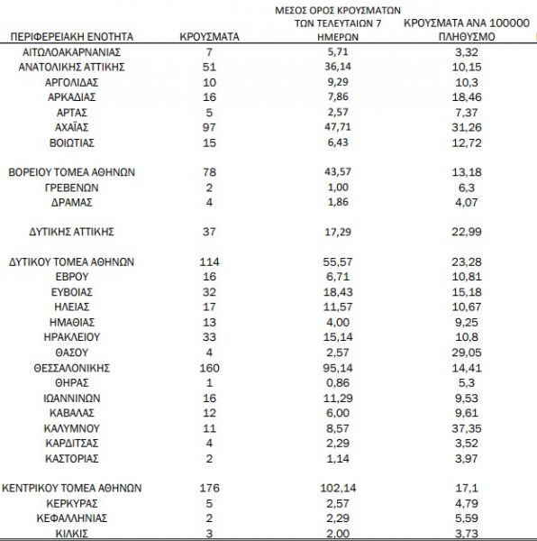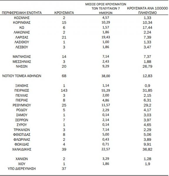 Με βάση τα επιβεβαιωμένα κρούσματα των τελευταίων 7 ημερών, 50 θεωρούνται σχετιζόμενα με ταξίδι από το εξωτερικό και 1497 είναι σχετιζόμενα με ήδη γνωστό κρούσμα.