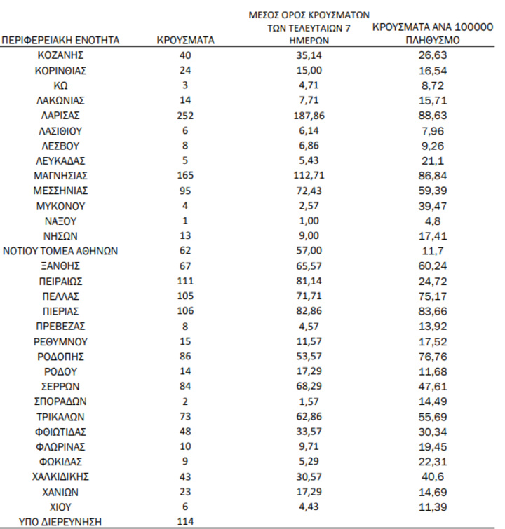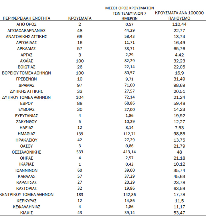 Με βάση τα επιβεβαιωμένα κρούσματα των τελευταίων 7 ημερών, 153 θεωρούνται σχετιζόμενα με ταξίδι από το εξωτερικό και 3.107 είναι σχετιζόμενα με ήδη γνωστό κρούσμα.