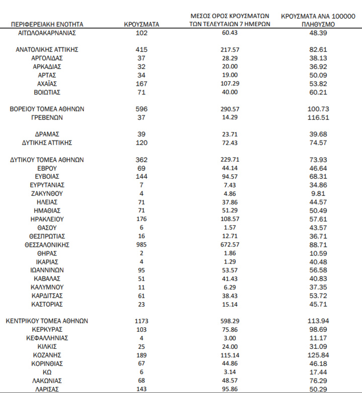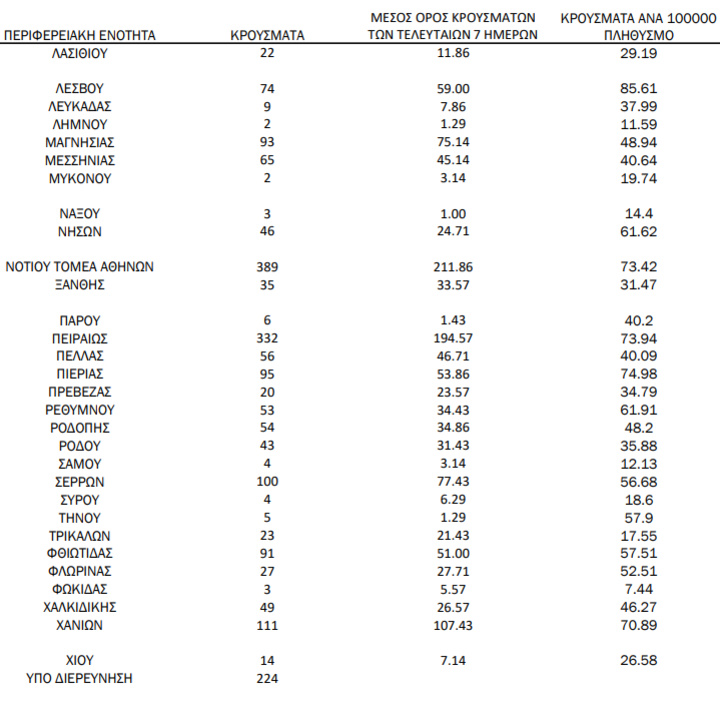 Με βάση τα επιβεβαιωμένα κρούσματα των τελευταίων 7 ημερών, 206 θεωρούνται σχετιζόμενα με ταξίδι από το εξωτερικό και 2.591 είναι σχετιζόμενα με ήδη γνωστό κρούσμα.